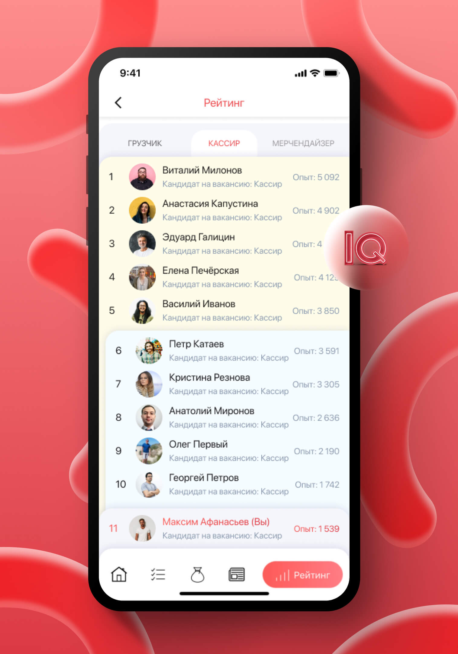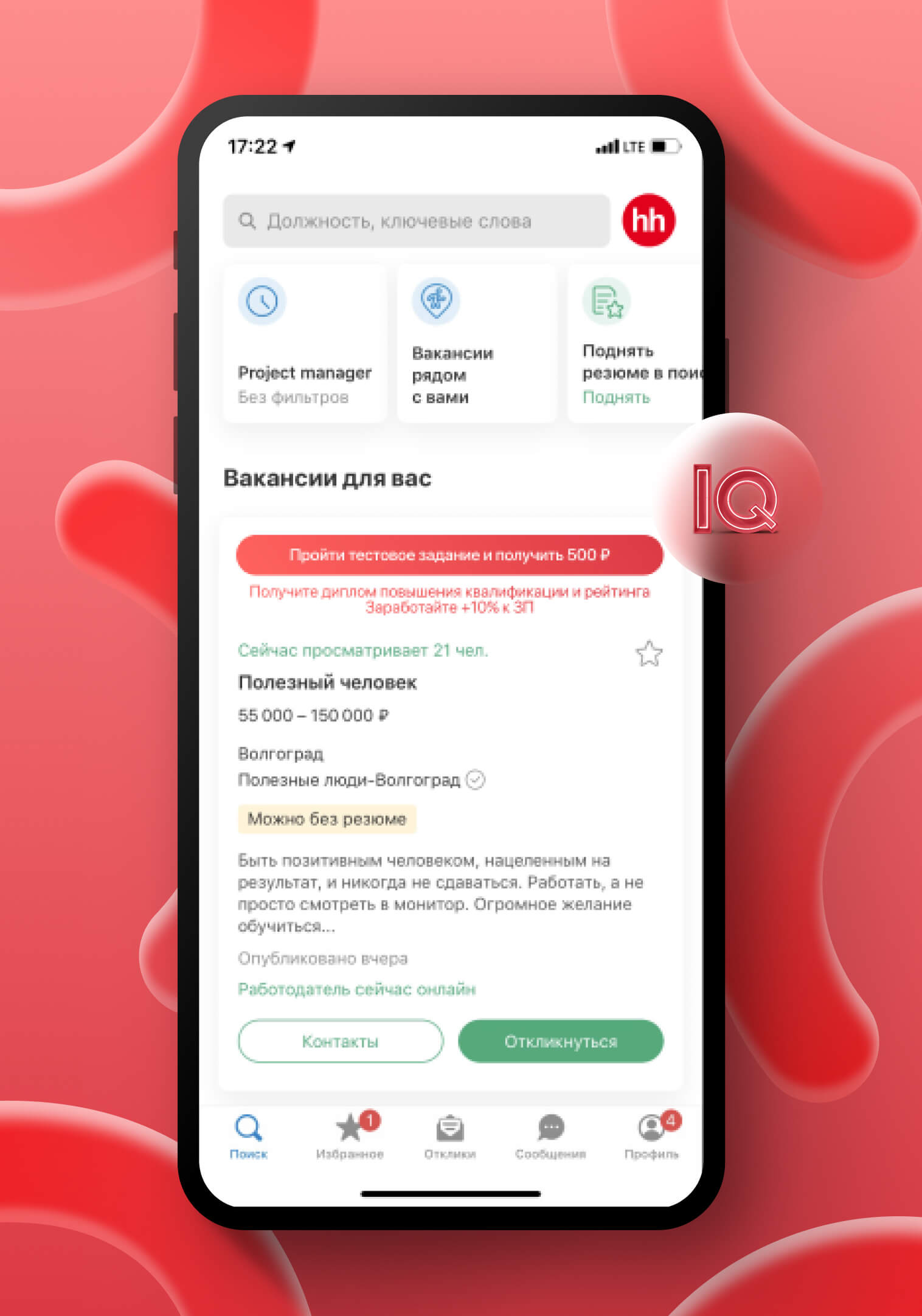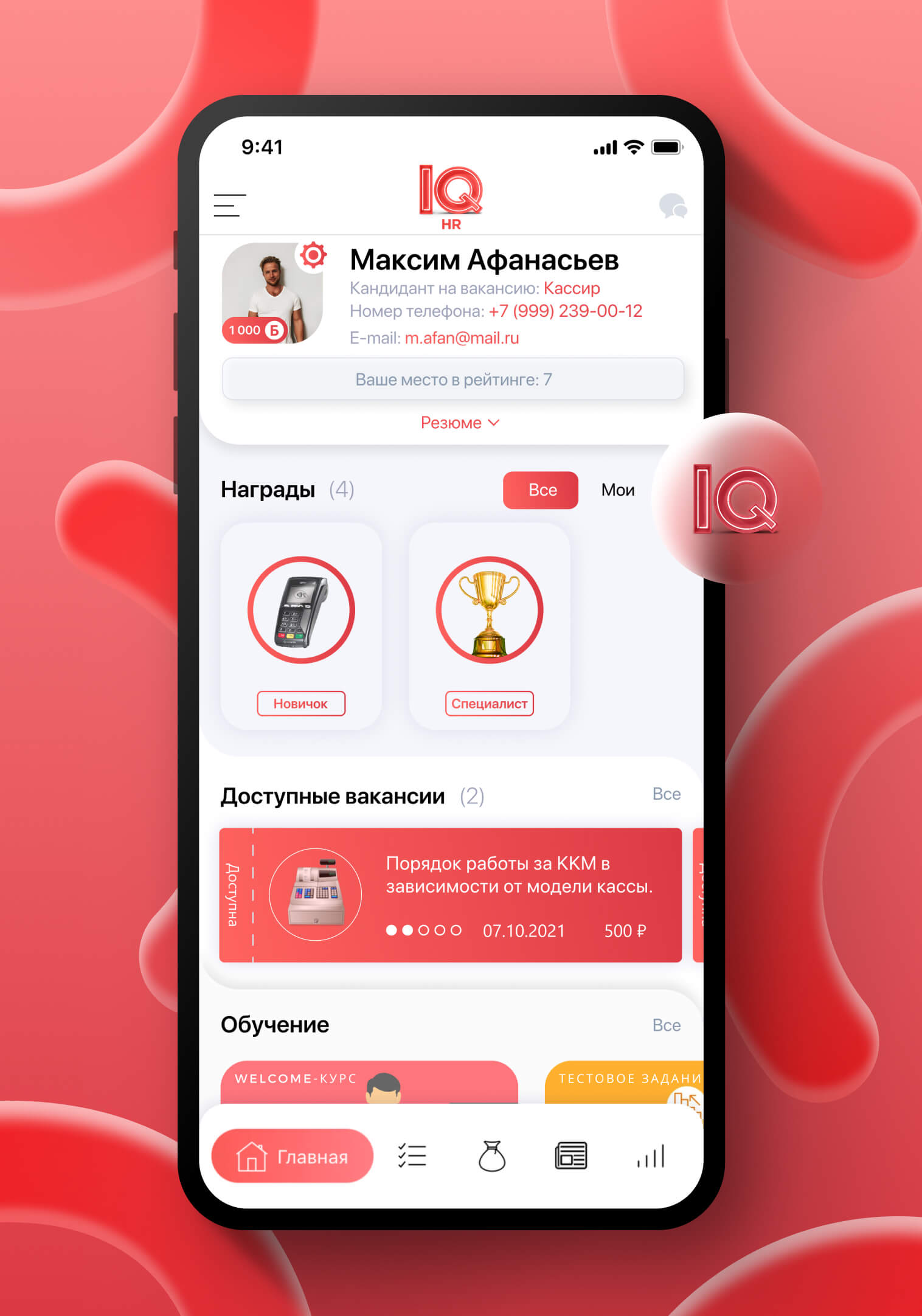 IQ HR — это инновационный софт для рекрутинга, позволяющий провести соискателя по автоматизированной воронке от отклика на вакансию до выхода на работу, максимально не задействуя HR-специалиста. Мы принципиально меняем устаревший подход к подбору сотрудников, позволяя кандидатам повышать квалификацию по выбранной вакансии до выхода на работу, давая денежное вознаграждение за отклик и 90% гарантию трудоустройства при успешном прохождении авто-тестирования.